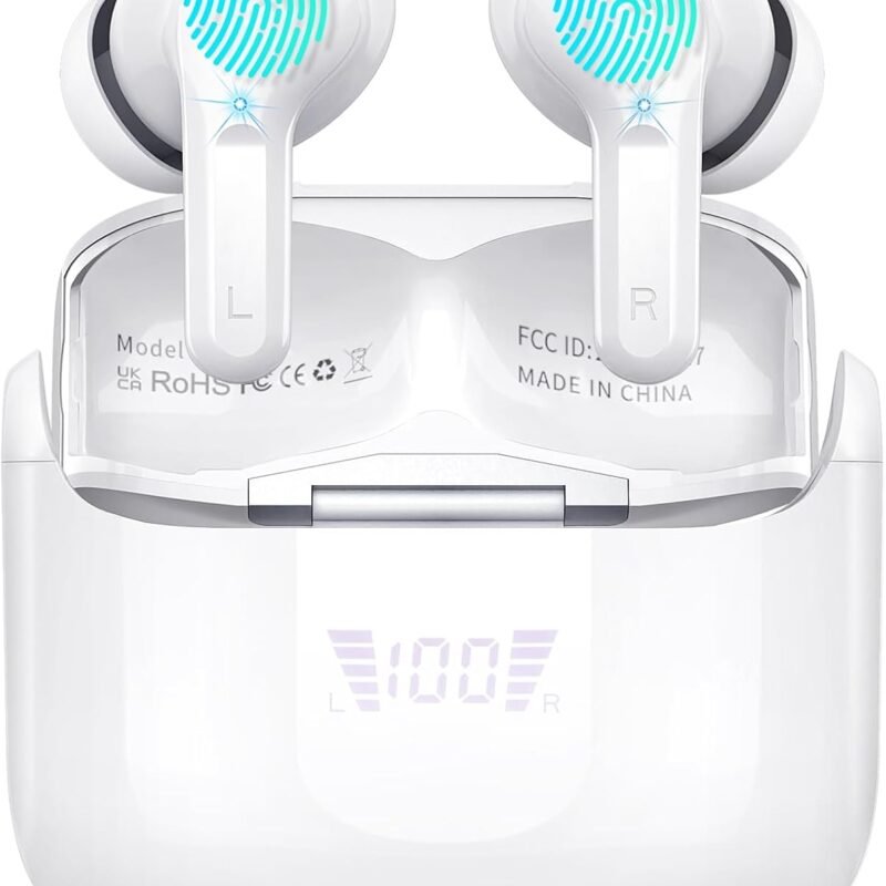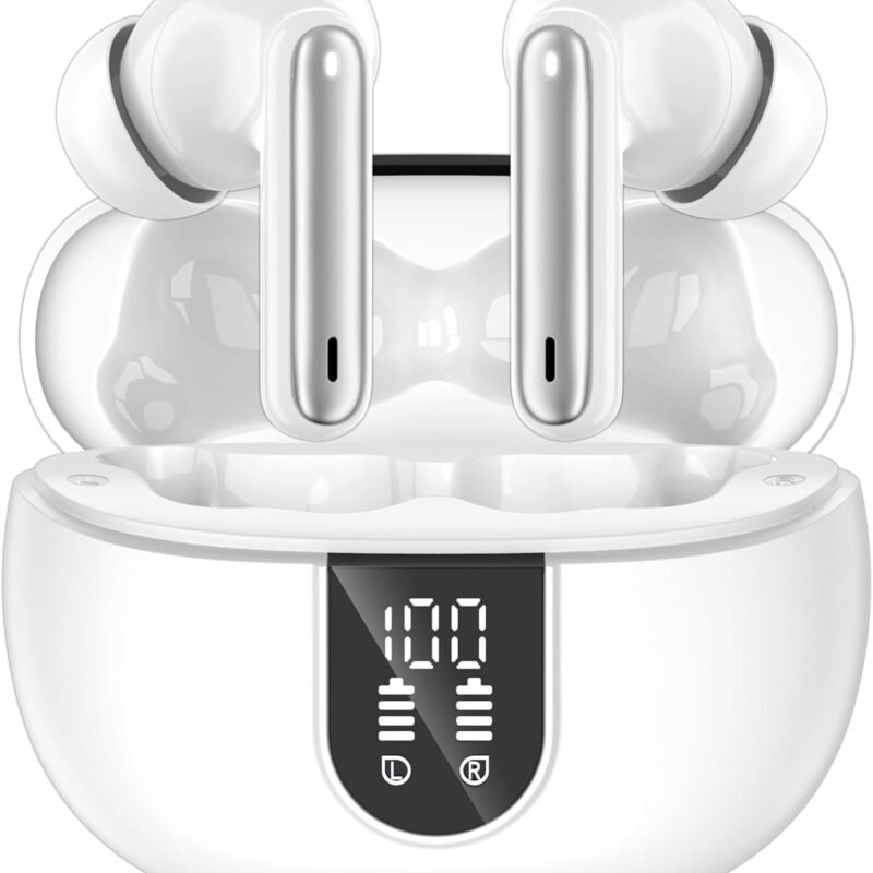 Bluetooth Wireless Earbuds Bluetooth 5.3 Headphones, 40Hrs Playback Stereo Ear Buds with LED Display Charging Case IPX7 Waterproof in-Ear Earphones with Mic for Phone Tablet Laptop Sports, White